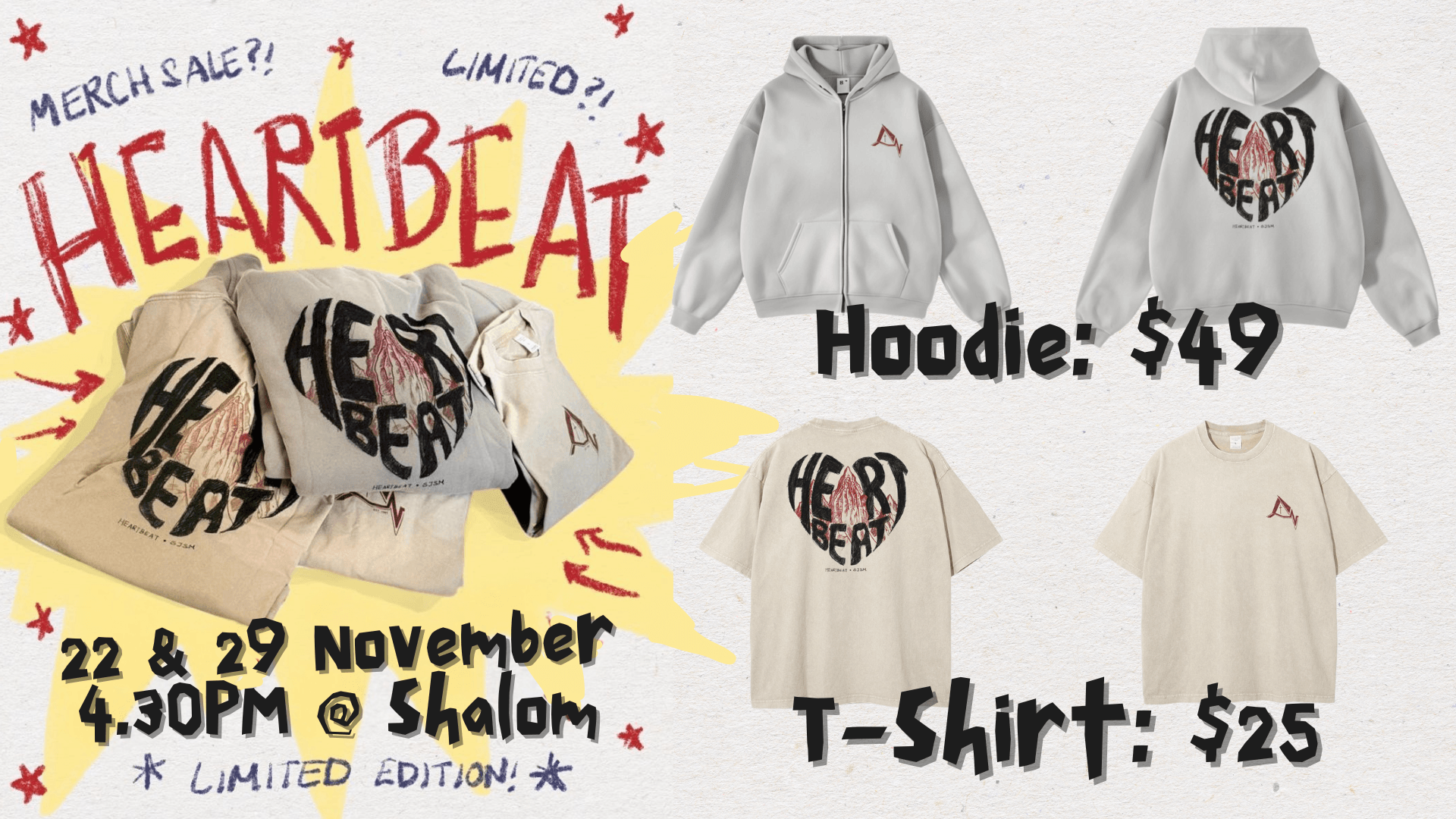 *Limited edition Heartbeat merchandise (t-shirt & hoodies) for sale on 22 & 29 Nov, 4:30pm at Shalom Hall! Come take a look!